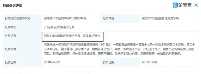 但据企查查深市质华市监罚字201800094号文件显示,2018年2月2日,华宝新能子公司广东电小二科技有限公司因产品(商品)质量违法行为被深圳市市场监督管理局龙华局依据特区法规→深圳经济特区产品质量管理条例2012版→第五章法律责任→第五十七条→违反本条例第二十三条、第二十五条规定的,由主管部门责令生产者、销售者停止生产、销售,没收违法产品,并处违法生产、销售产品货值金额三倍的罚款;有违法所得的,并处没收违法所得;对电小二处以罚款116400元,没收违法所得、没收非法财物。也不知道是哪边出了差错。