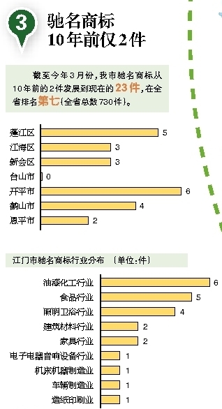 近年来,江门市工商局紧扣创新驱动重大部署,充分发挥商标服务职能作用,精准发力,有效推动商标品牌战略加快实施,促进经济转型升级取得了初步成效。一是精准扶持。作为建设全国小微“双创”示范基地城市的一项配套政策,我市在全省率先对新认定为驰名、著名商标的小微企业,新注册的涉外商标、证明商标、集体商标等进行专项资金奖补扶持,单个商标最高奖励20万元。截至目前,已发放奖补资金30多万元。二是全省率先建成集商标查询(含涉外商标注册)、商标管理、统计分析、商标预警、维权援助等功能于一体的商标品牌援助平台。