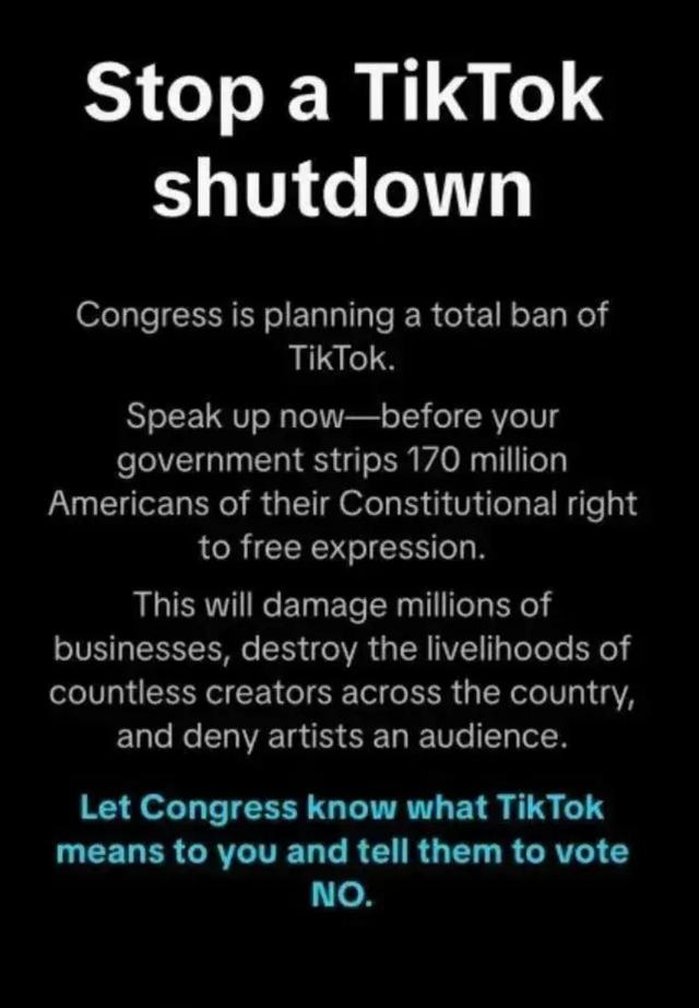 国会正在考虑完全禁止Tik Tok。这意味着政府可能会限制1.7亿美国人的自由表达权利!如果你认为这是不公平的,请不要沉默!这项禁令可能会对数百万美国企业和许多创作者的生计造成严重影响。让国会明白Tik Tok对你的重要性,并让他们知道你的看法!