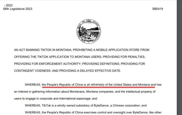 而在2023年5月,蒙大拿州政府通过了SB0419法案,宣布全面禁止TikTok,理由是为了保护用户个人隐私,防止被中国共产党盗取。