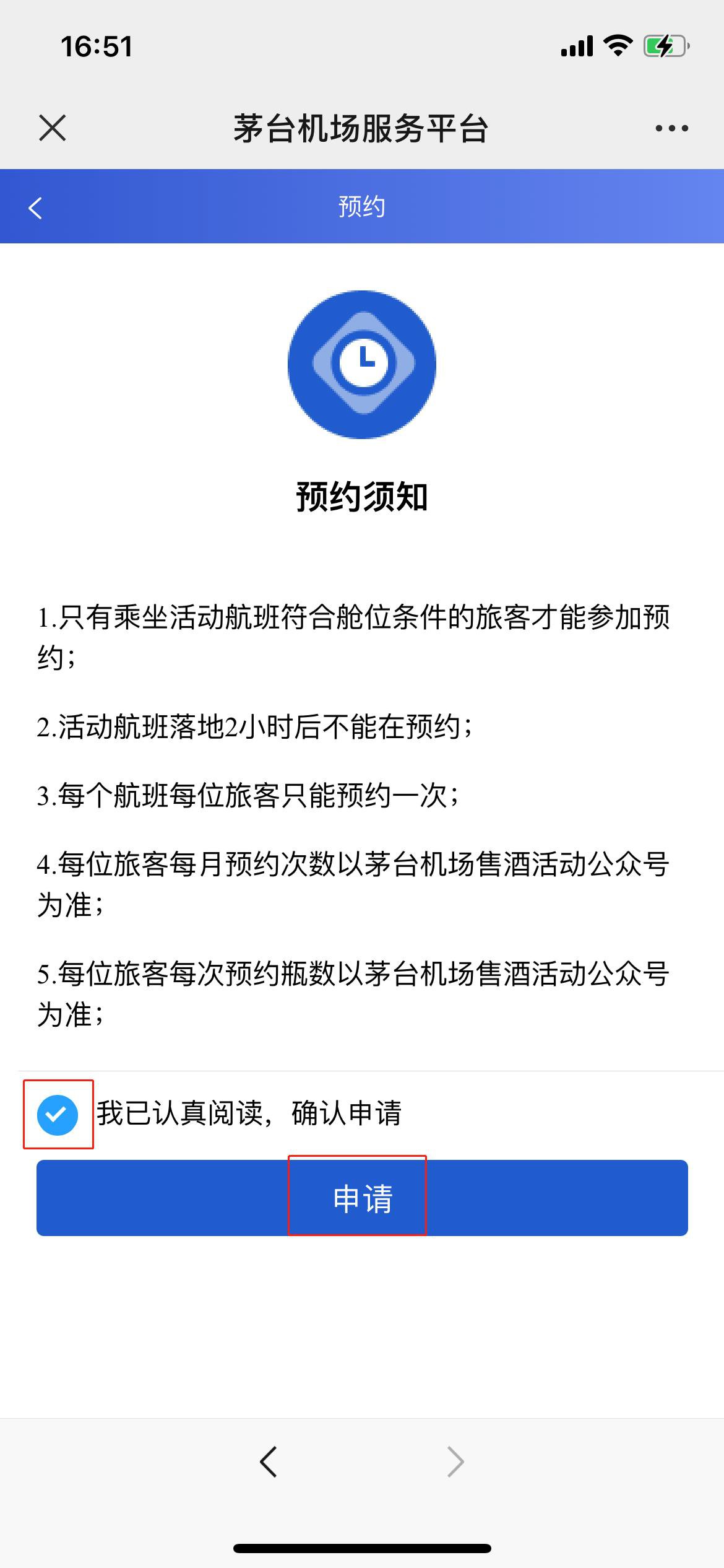 1.点击首页航班售酒预约模块,进入航班售酒预约,请认真查看预约须知,勾选后申请预约;