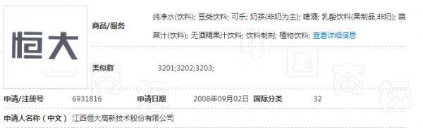 本案的主角商标是一枚名为“恒大”的第,使用在“纯净水、豆类饮料、可乐、奶茶”等商品上。虽然跟“恒大冰泉”、“恒大地产”没有关系,但依然是一枚价值比较高的商标。