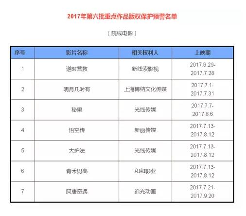 【版权局公布2017年度第六批重点作品版权保护预警名单】