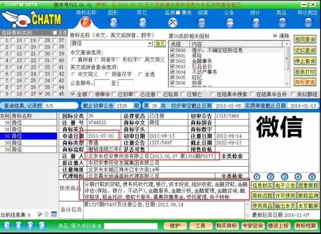 事实真是这样吗?经查询,关于“微信”在第36类金融服务商标里,确有中欣安泰的注册信息,该信息显示中欣安泰的商标申请日期是2011年7月20日,注册公告日期是2012年9月14日。