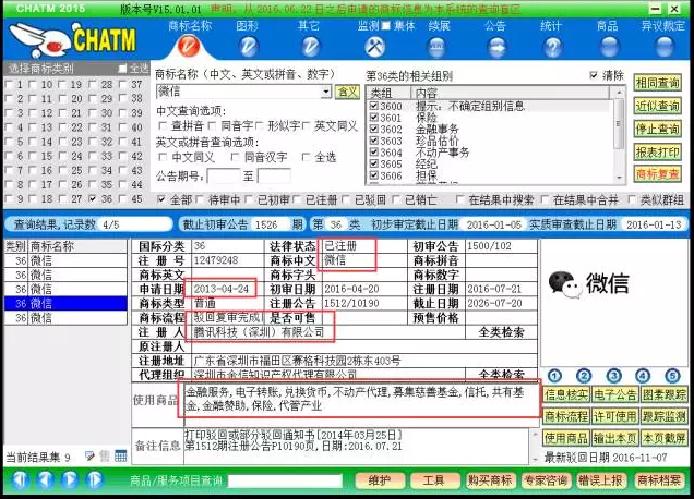 查询结果显示,腾讯科技(深圳)有限公司也注册了第36类金融服务里的“微信”商标,商标除了微信二字还加上了微信的logo,属于图文类复合商标。官网资料显示,腾讯这一商标申请日期为2013年4月24日,注册公告日期为2016年7月21日。