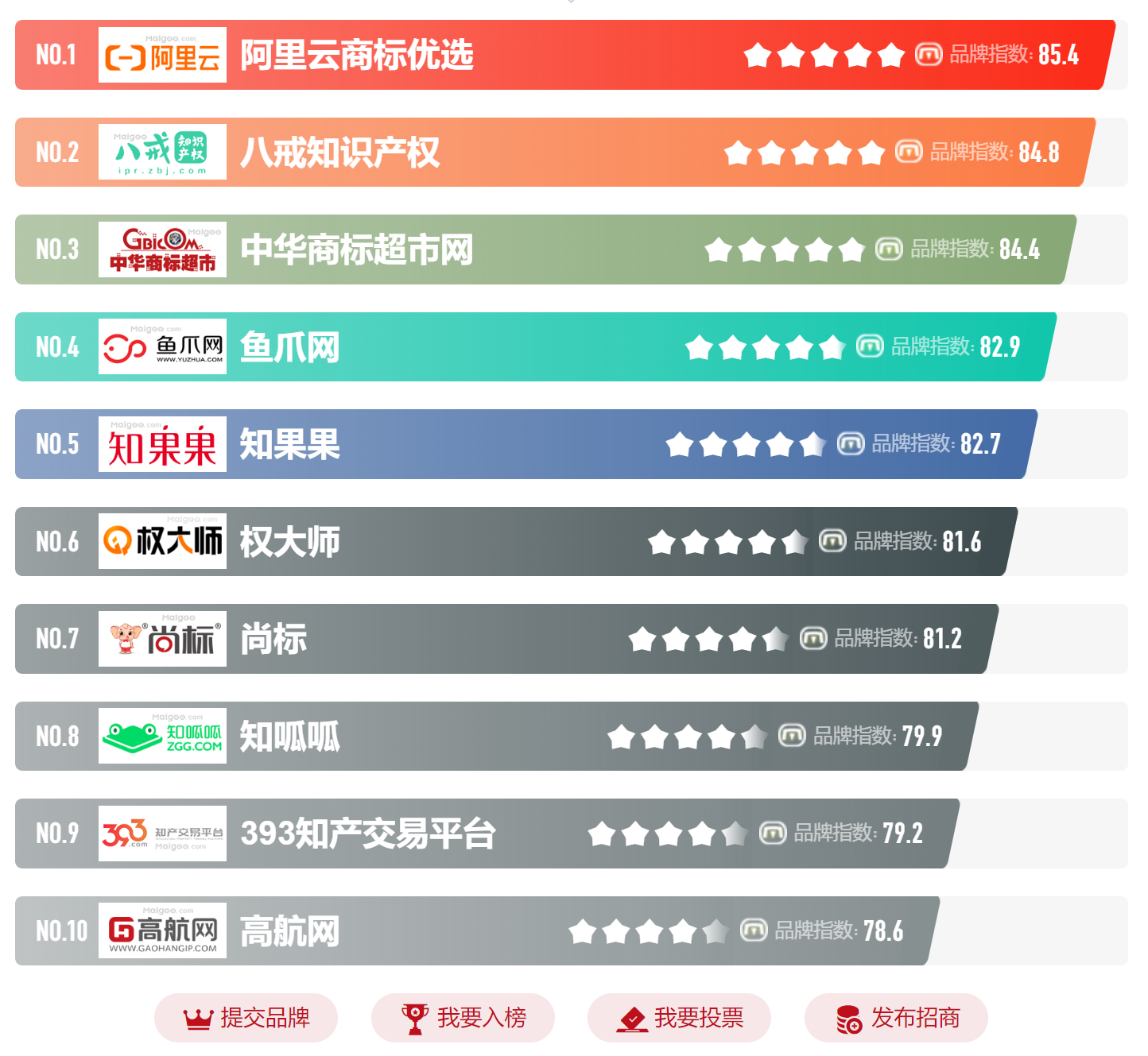 2023年商标转让平台十大品牌榜中榜如下