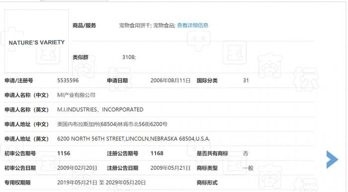 但直至今日,美国 MI 公司只在国内注册了 "Nature ’ s Variety" 和 "Instinct" 商标,并未注册 " 百利本能 " 商标。只不过," 百利本能 " 商标也已被注册,权利人为沈阳艾尔玛商贸有限公司(下称 " 艾尔玛公司 ")。