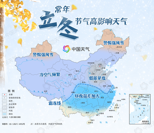 常年立冬节气开始,冷空气活动更加频繁,实力也更加强劲,通常可南下影响江南甚至华南地区。从中国天气网推出的立冬节气高影响天气地图可以发现,立冬时节,冷空气活动频繁,新疆北部和东北地区需要警惕强风雪,霜冻线已抵达江苏南部、安徽南部至湖北北部一线,南方大部昼夜温差也逐渐加大。
