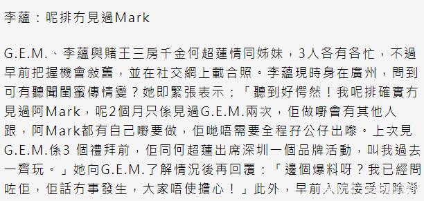 李蕴认为Mark和邓紫棋自己的工作,没必要全程出双入对,似乎不太相信。