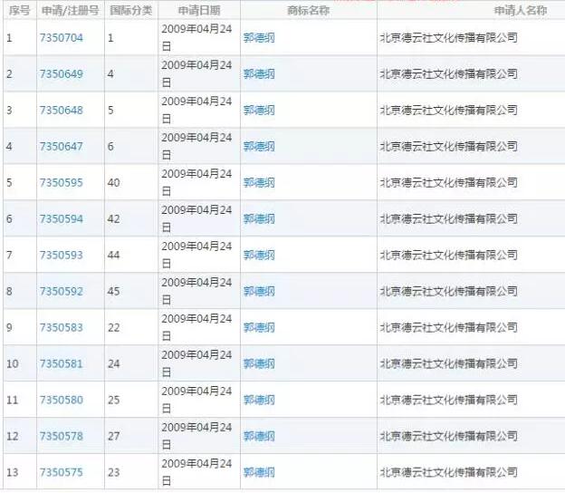 虽然商标法中有“在先姓名权”可以作为保护,但是对于明星大咖来说,自己的名字如果被注册到去污剂、磨牙剂上,那也是非常糟糕的一件事。在对自己姓名权的保护上,相比小鲜肉,郭德纲就是一位深谋远虑的主~他早早的就对自己的名字申请了全类别保护。