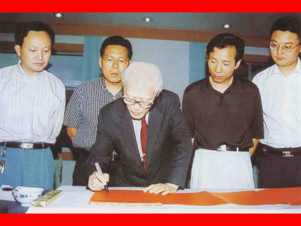 第2届红豆七台湾著名诗人余光中,参加完红豆相思节活动后,来到红豆集团参观时,为七夕红豆相思节提字:《一粒红豆,千年因缘》