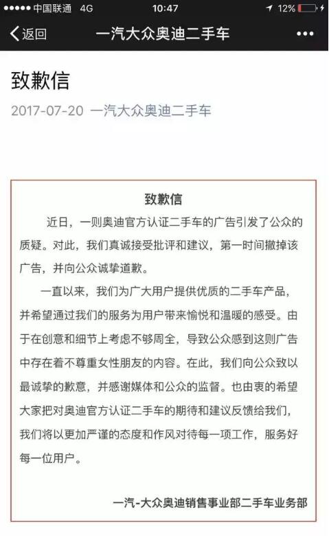 不过网友似乎并不满意这次的道歉,认为道歉信中所强调的,“公众感到这则广告中存在不尊重女性朋友”的内容有歪曲事实的意思,毕竟这不是公众感到,是确实存在,但是,不管怎么说,奥迪选择在出事之后,下架广告并且公开道歉,也印证了客户的感受,才是一个品牌最需要重视的地方。