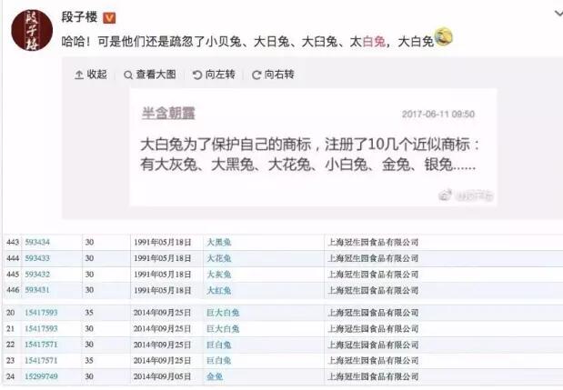 大家小时候吃的正版大白兔奶糖是上海冠生园食品有限公司出品的。在国家工商管理总局商标局系统中,上海冠生园食品确实注册了很多类似商标,例如2014年注册的“巨大白兔”、“巨白兔”、“金兔”;1991年注册的“大黑兔”、“大花兔”、“大灰兔”、大红兔”。