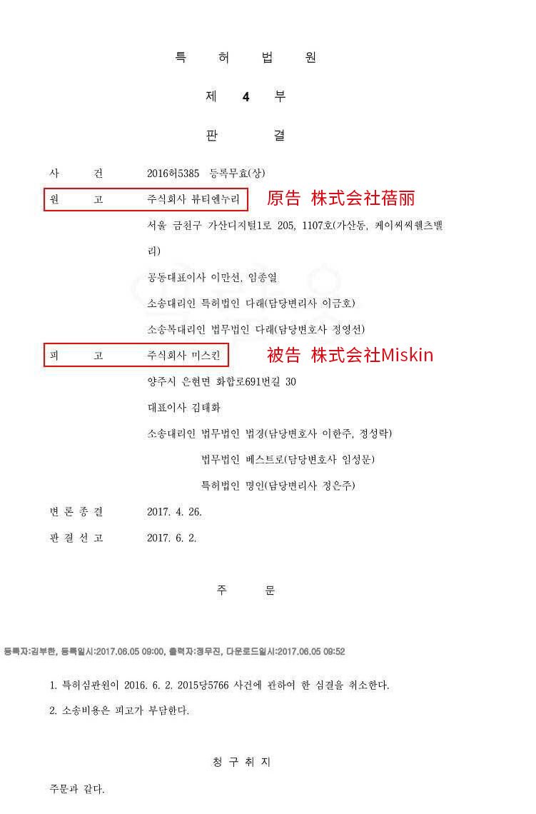 经双方提交的凭证及法院调查,2015年株式会社Miskin在韩国恶意注册Diaforce贵妇眼膜商标。故意将其名称、商标、包装模仿Rearar Diaforce。以各种方式大肆宣传,有意误导客户、混淆视听,严重影响了株式会社蓓丽的声誉。2016年,韩国专利法院立案受理了株式会社蓓丽起诉株式会社的侵权案件,案号2016许5385注册无效(商),并于近日作出判决,株式会社蓓丽胜诉。株式会社Miskin申请的Diforce贵妇眼膜商标注册无效,今后如有继续销售Miskin相关违法产品的行为,株式会社蓓丽保留诉诸法律的权利。
