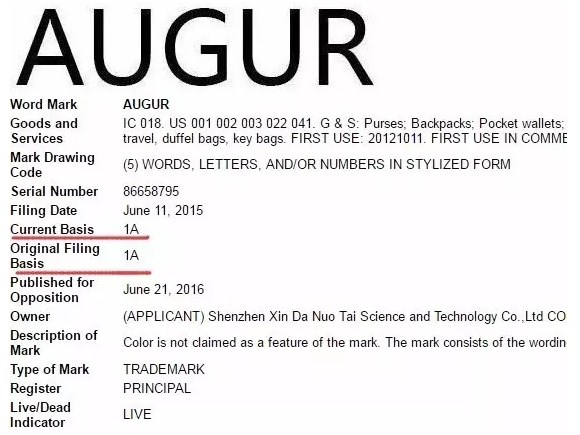 2.自注册商标的重要概念美国商标自注册有一个非常重要的概念:Filling Basis。任意在uspto(美国商标局)网站搜索一个商标如Augur,会看到如下信息。