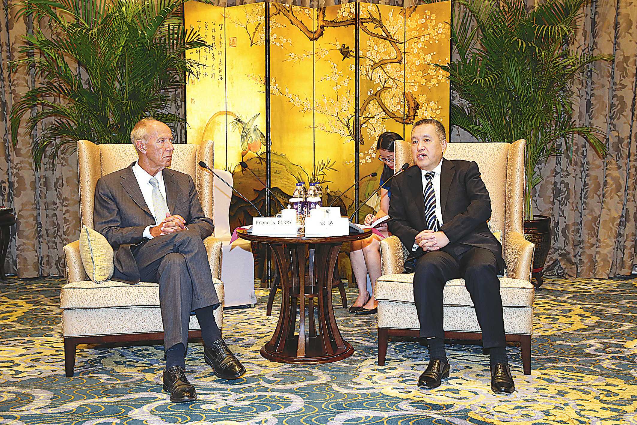 六月二十八日,国家工商总局局长张茅在江苏扬州会见来华出席世界地理标志大会和“中国商标金奖”颁奖活动的世界知识产权组织总干事弗朗西斯·高锐一行。□本报记者栗世民/摄