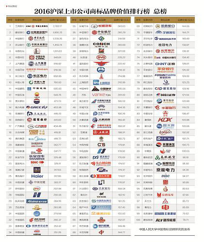 6月26日消息 中国人民大学中国商标网品牌研究院6月26日在京发布《2016沪深上市公司商标品牌价值排行榜》(“《排行榜》”)。《排行榜》由上市公司商标品牌价值总榜和行业分榜组成。总榜从全局的角度对沪深上市公司中最具价值的商标品牌进行了考察、排序,共有100家企业上榜。分榜选取了10个贴近终端消费者、体现中国制造概念并符合国家品牌发展战略的细分行业,结合行业特点对行业知名商标品牌进行了排序。