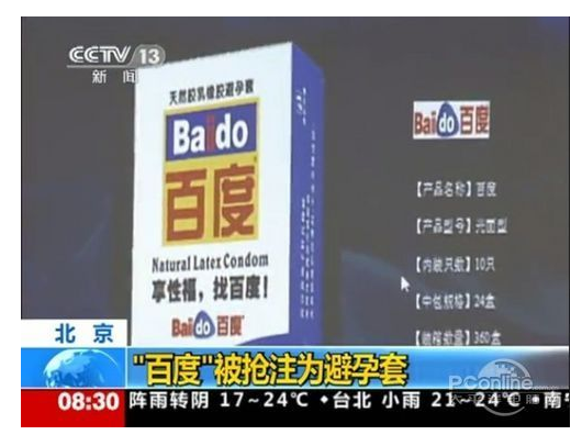 百度:百度也曾被抢注为安全套。据央视报道,深圳一公司生产“百度“牌安全套,被百度告上法庭,百度赢得官司,这是2015年的事。