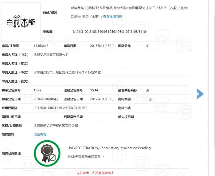 艾尔玛公司于 2015 年 11 月 30 日提交了第 18463413 号 " 百利本能 " 的商标注册申请,核定使用在第 31 类动物食品、动物饲料等商品上,2017 年 1 月 7 日获准注册。而在此之前,"Nature ’ s Variety" 和 "Instinct" 品牌就以 " 百利 "" 本能 " 的中文名为国内消费者熟知。