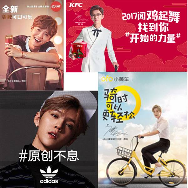 因此鹿晗也成为各大品牌的代言人,阿迪达斯,肯德第,ofo,可口可乐,鹿晗几乎遍布我们的生活当中。