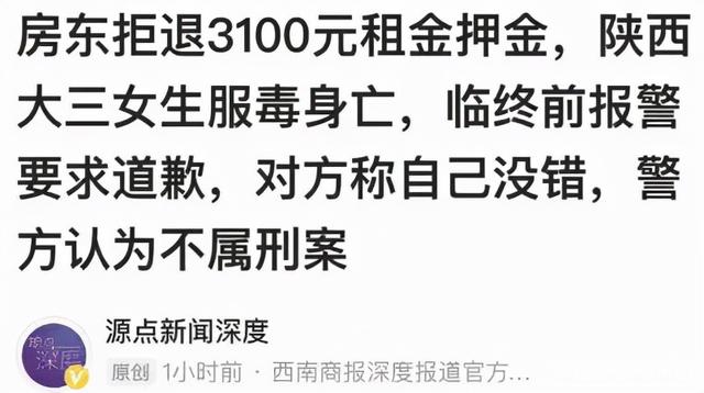 陕西一名大三的女学生,在房东拒绝退还她3100元的押金后,服农药自杀了。